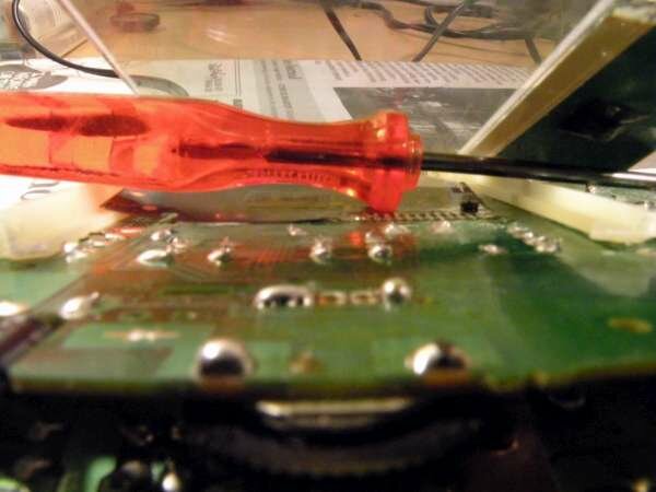 Carefully pry up the screen by inserting a small flat-headed screwdriver into the notch between the LCD (liquid crystal display) and plastic housing.
