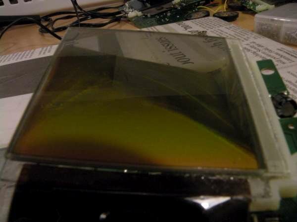 Insert a razorblade onto a corner of the LCD. If you are only removing the rear reflective film, be sure not to go too deep! If you are removing the reflective film AND polarized film, you can be a bit less cautious and insert your razorblade between the glass panel and film. Now, using your razorblade as a lever, peel back a corner of your film(s). If your corner is a greenish tint, you still have the rear polzarized film attached. If it is a light gray, you have removed the rear polarizer as well. If you accidentally removed the polarizer and didn't intend to, remove the razorblade and try again on another corner of the LCD. You have three chances at this, as there are three exposed corners of the LCD, two of which are easier to start at, the third being on the top right of the screen and a bit difficult, and the fourth, at the lower right, completely inaccessible.